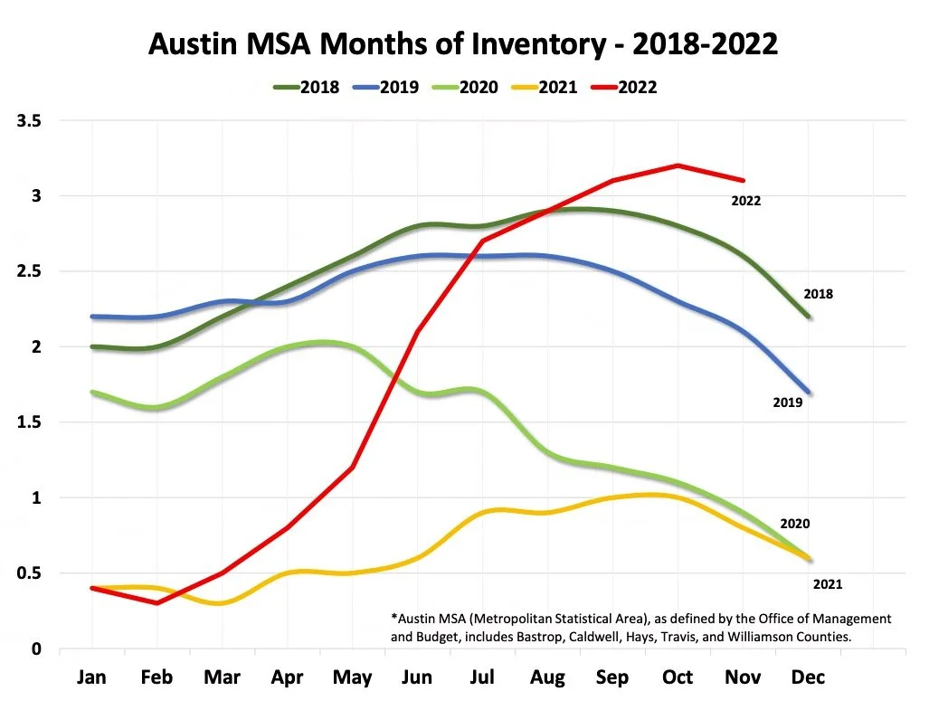 Historically, such drastic interest rate increases would have completely upended the market, but a number of factors have kept the Austin market from going bottom-side-up and have ultimately brought us to a point of stability. This is best represented through a closer look at the months of inventory that we have on hand.